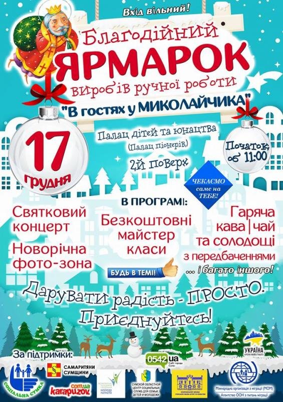 В Сумах состоится благотворительная ярмарка «В гостях у Миколайчика», где можно приобрести оригинальные новогодние украшения и подарки, а также помочь воспитанникам «Сумского центра социально-психологической реабилитации детей области».