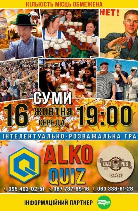 Наприкінці вересня - початку жовтня всі відзначають "October-Fest" тому ми вирішили, що це саме час для проведення тематичної гри в цьому напрямку. Це перша тематична гра QUIZ в Сумах. Цього разу тематика буде направлена на питання про алкоголь: його походження, історію, цікаві факти та багато іншого!