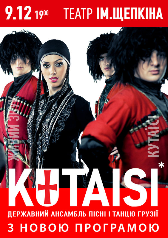 «KUTAISI» – це унікальний державний ансамбль Грузії, що поєднав в собі хвилюючий багатоголосий спів з віртуозним виконанням національних грузинських танців. Неповторні постановки і хореографія під супровід оркестру, роскішні костюми та чаруючі голоси.