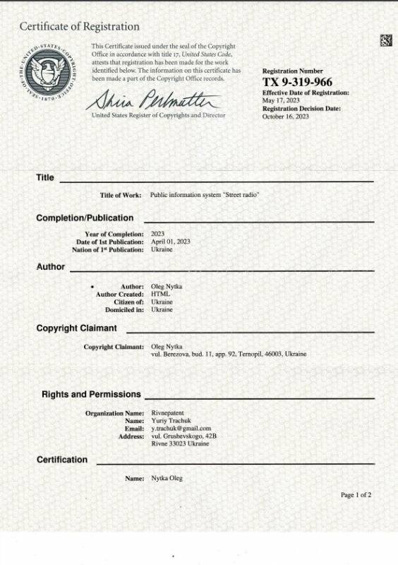 Комп’ютерна програма Система Інформування Населення (СІН) «Вуличне радіо» створена Українськими програмістами котра забезпечує повноцінне функціонування і роботу системи сповіщення «Вуличне радіо». Даний програмний продукт є запатентований і захищений авторським правом як в Україні так і в США.