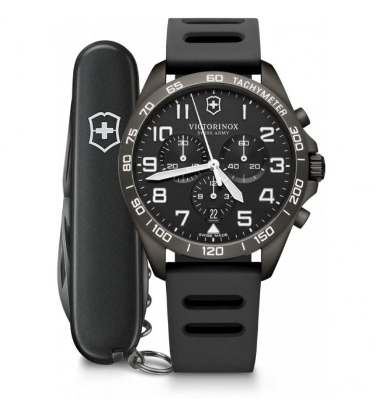 Victorinox Swiss Army V241926.1, а этот набор станет шикарным презентом для босса или заслуженным подарком лично для себя. Потому что, покупая часы, вы получаете в комплекте ещё и, тот самый, швейцарский нож! Чёрный металлический корпус 42 мм в диаметре, с PVD покрытием и тахиметрической шкалой на безеле, функция хронографа и даты, каучуковый ремешок и сапфировое стекло – вот чем порадует будущего владельца эта серьёзная модель. И, конечно, не забудьте, что в этих часах можно плавать – защита 10 ATM. Производитель даёт гарантию на свои изделия целых 5 лет!