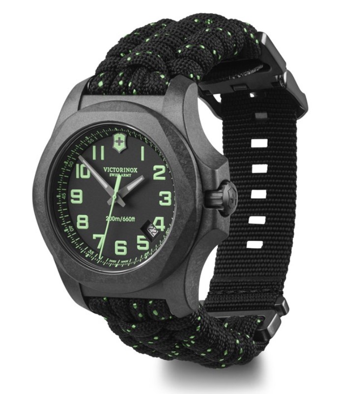 Ещё один бокс, мимо которого сложно пройти Victorinox Swiss Army V241859. Эту модель по-настоящему оценят военнослужащие. Во-первых, прочный ремешок из паракорда (гладкий полимерный шнур, который используется в стропах парашютов, изготовленный из нейлона). Во-вторых, дополнительная накладка на корпус, которая защищает от ударов, сколов и царапин. В-третьих, дополнительный каучуковый ремешок для замены (когда хочется выйти в гражданском, с презентабельным аксессуаром на руке или, когда паракордовый уже неактуален). Сам кейс Викторинокс, в котором поставляются часы, как особый вид искусства. В нём удобно хранить часы, если какое-то время не носите их на запястье. 200м водозащиты, а это не только поверхностное плаванье, но и погружение под воду. Яркие люминесцентные цифры и стрелки видно в любом освещении. Диаметр корпуса равен 43 мм. Сапфировое стекло не боится появления царапин, оно суперпрочное.