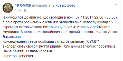 На официальной странице 15-го отдельного мотопехотного батальона «Сумы» в фейсбуке появилось сообщение о том, что в результате обострения ситуации в зоне АТО войско в ночь на 8 ноября понесло потери.