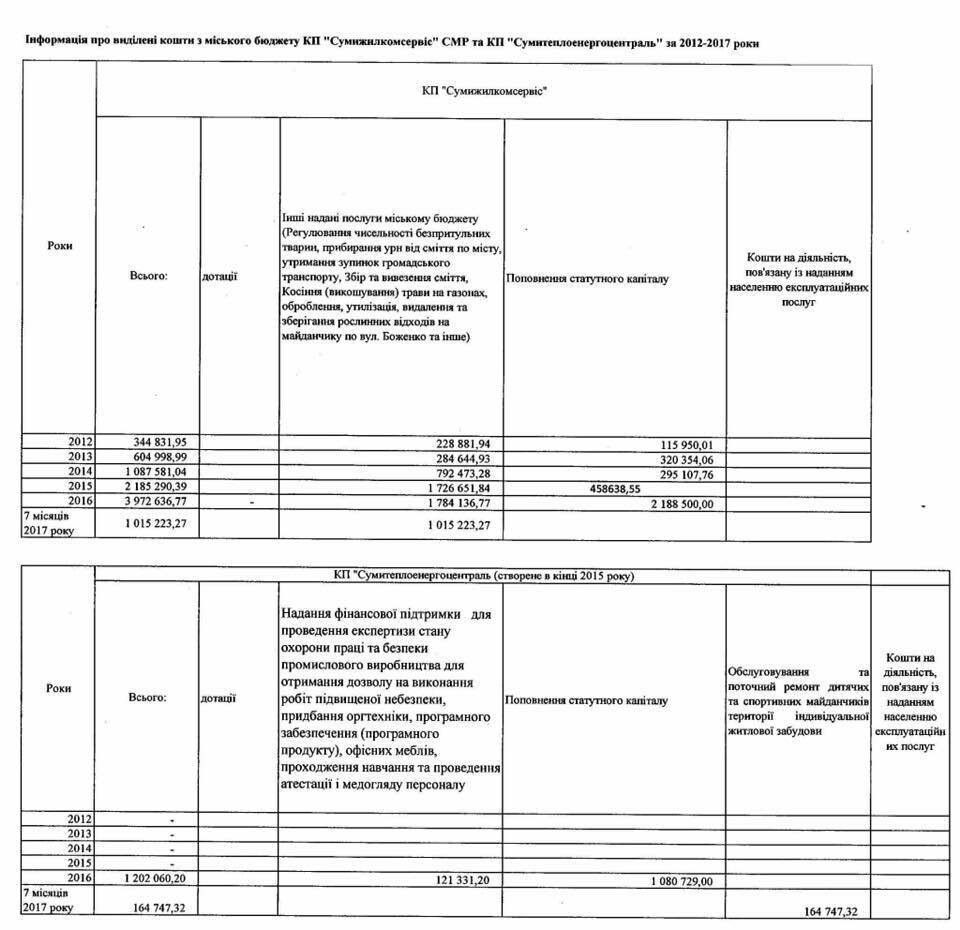 Несмотря на довольно неплохие доходы КП, они не стесняются брать деньги из городского бюджета. Так, на протяжении 2012-2016 гг. «Сумыжилкомсервис» получил с городского бюджета свыше 8 млн. грн, из которых порядка 3,4 млн грн – это пополнение статутного капитала.
