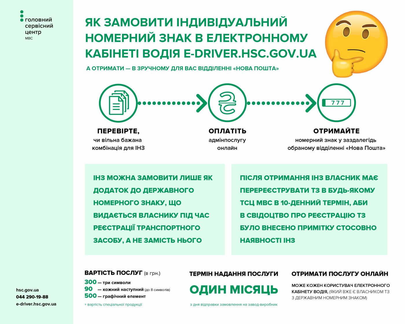 Відтепер громадянин також може перевірити можливість замовлення конкретного індивідуального номерного знаку, замовити та оплатити його виготовлення просто не виходячи з дому. Забрати готовий номерний знак водій зможе в зручному за розташуванням відділенні “Нова пошта”, яке він самостійно обирає під час замовлення знаку. Переведення послуги в онлайн-площину дозволить державі спростувати міфи, пов’язані з отриманням ІНЗ, зробить послугу більш популярною та знищить будь-які корупційні ризики. Проект реалізований у партнерстві Головного сервісного центру МВС і Державного агентства з питань електронного урядування України та за підтримки проекту USAID/UK aid «Прозорість та підзвітність у державному управлінні та послугах»/TAPAS і Фонду Східна Європа, і є лише першим із серії важливих кроків з діджиталізації послуг сервісних центрів МВС, запланованих на найближчі півроку. Зокрема, в майбутньому планується запуск повноцінної прозорої системи замовлення усіх державних номерних знаків через Електронний кабінет водія, що матиме ще більший антикорупційний ефект.