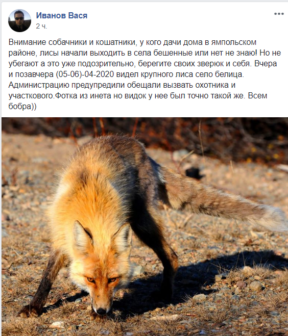 «Внимание собачники и кошатники, у кого дачи дома в Ямпольском районе, лисы начали выходить в села бешенные или нет не знаю! Но не убегают а это уже подозрительно, берегите своих зверюк и себя. Вчера и позавчера (05-06)-04-2020 видел крупного лиса село Белица. Администрацию предупредили обещали вызвать охотника и участкового.Фотка из инета но видок у нее был точно такой же. Всем бобра))», - йдеться в повідомленні.