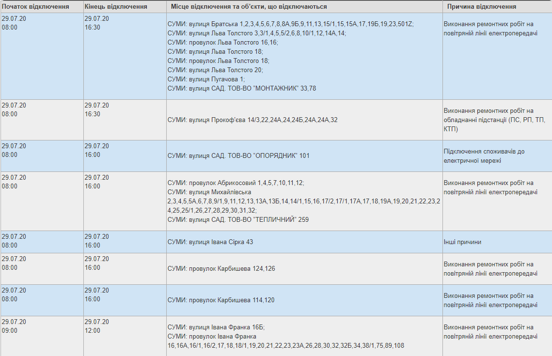 Філія «Сумський міський район електричних мереж» ПАТ «Сумиобленерго» повідомляє про планові відключення електричної енергії 29 липня.