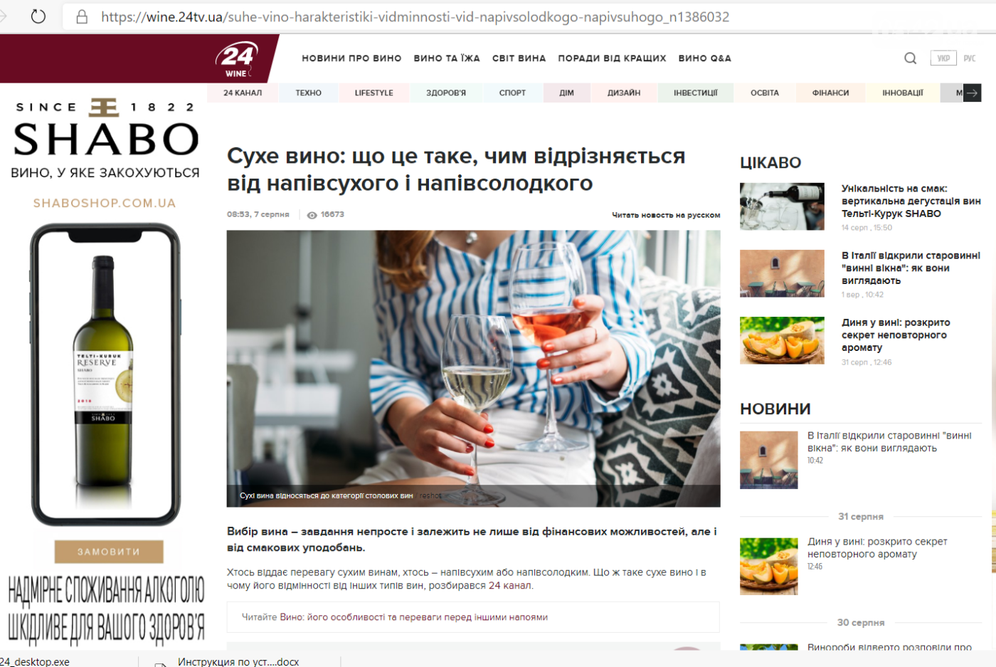В Україні з’явився масштабний проєкт, мета якого — популяризація винних знань та винної культури. Wine24 — образотворча онлайн-платформа, що була створена компанією SHABO спільно з 24 телеканалом на базі порталу 24tv.ua. Тут представлені найсвіжіші новини світового виноробства, інтерв’ю та колонки відомих вітчизняних та міжнародних винних і гастрономічних експертів, блогерів, сомельє, рестораторів і технологів. Читачі ресурсу зможуть дізнатися про технології виробництва і стилі вин, про тонкощі винної індустрії в Україні та за кордоном, про секрети вдалого поєднання вин та гастрономії, про особливості вирощування винограду, і, звісно ж, про те, які вина, коли і як варто вживати. Вся інформація викладена цікаво, зрозумілою мовою, що наближає винну культуру до споживачів.