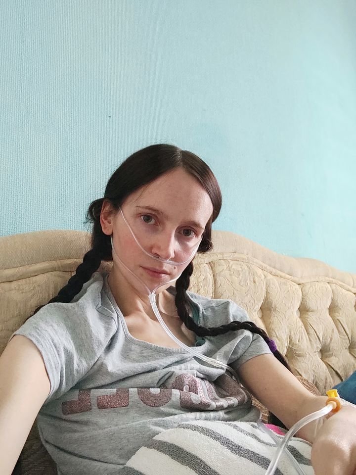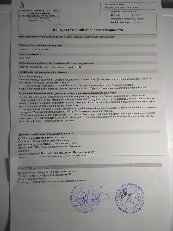 32-річна Юлія Савченко з Шостки страждає від вродженого захворювання. У неї — кістозна гіпоплазія обох легень, деформація грудної клітки, бульозна емфізема, хронічне легеневе серце, вторинна легенева гіпертензія.
