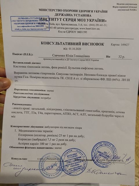 Кілька років тому хвороба почала прогресувати. Юля скаржиться на сильну слабкість, задишку при мінімальному фізичному навантаженні, колючий біль у грудях і вже майже не може говорити (ледь чутно).