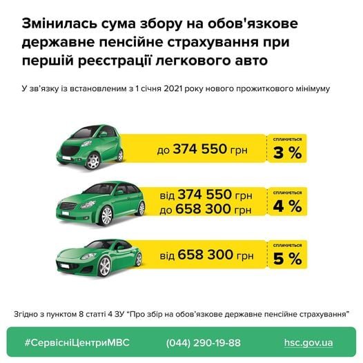З 1 січня 2021 року, у зв’язку з встановленням прожиткового мінімуму для працездатних осіб, змінилися відповідні ставки збору на обов’язкове державне пенсійне страхування під час першої державної реєстрації легкових автомобілів.