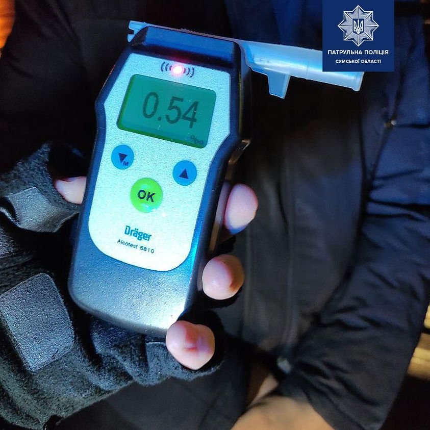 У присутності свідків водій пройшов огляд на стан сп’яніння. Результат позитивний — 0,54 проміле. З результатом чоловік погодився.