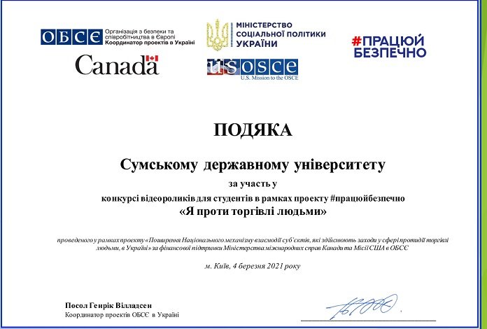 Волонтери Сумського державного університету взяли участь у всеукраїнському конкурсі відеороликів для студентів в рамках соціального проєкту #працюйбезпечно «Я проти торгівлі людьми».
