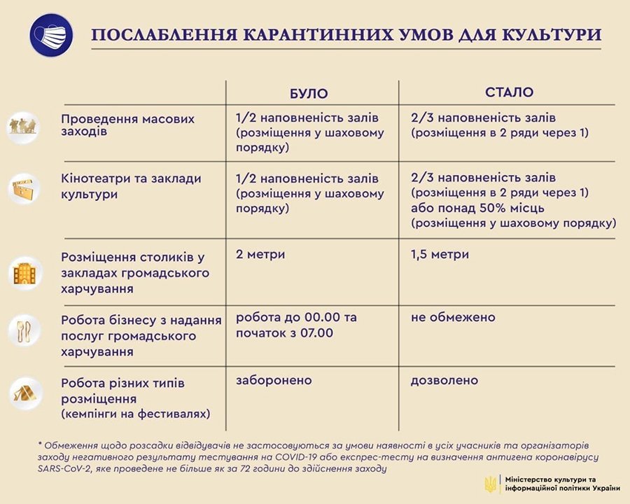 - приймання відвідувачів у кінотеатрах, інших закладах культури з наповненістю кінозалів або залів понад 2/3 місць (розміщення здійснюється з дотриманням заповнення двох рядів відвідувачами і одним порожнім рядом) або понад 50% місць (розміщення здійснюється з дотриманням шахового порядку, зокрема для груп із двох осіб) у кожному окремому залі;