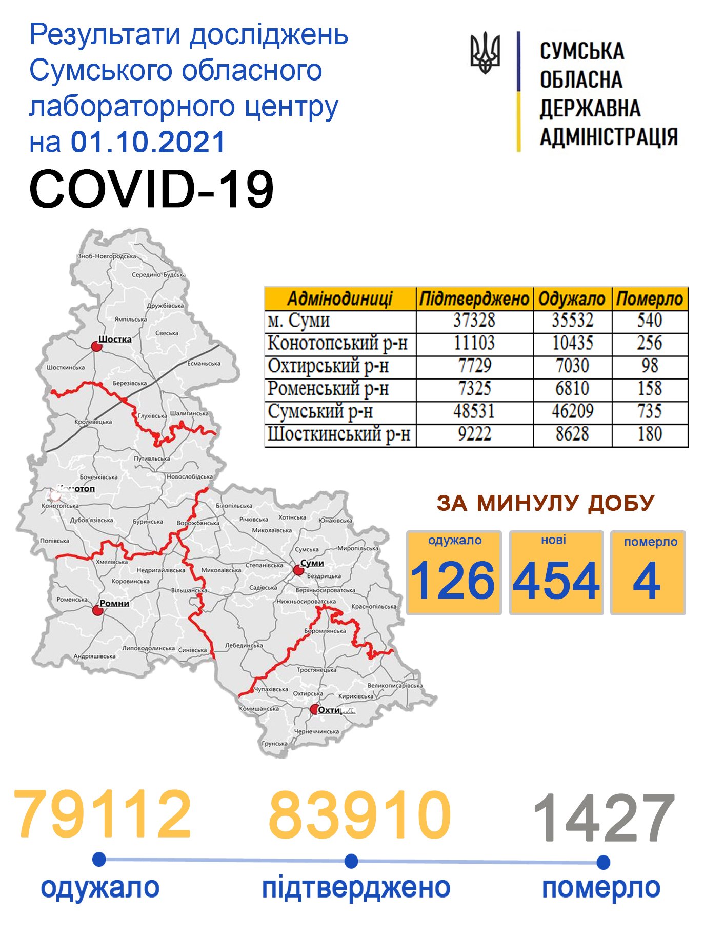COVID-19 підтвердили у 454 осіб (Конотопський р-н – 88, Охтирський р-н – 47, Роменський р-н – 57, Сумський р-н – 229, Шосткинський р-н – 33)