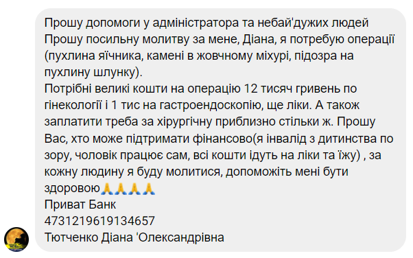 Потрібні великі кошти на операцію 12 тисяч гривень по гінекології і 1 тис на гастроендоскопію, ще ліки. А також заплатити треба за хірургічну приблизно стільки ж. Прошу Вас, хто може підтримати фінансово (я інвалід з дитинства по зору, чоловік працює сам, всі кошти ідуть на ліки та їжу), за кожну людину я буду молитися, допоможіть мені бути здоровою.