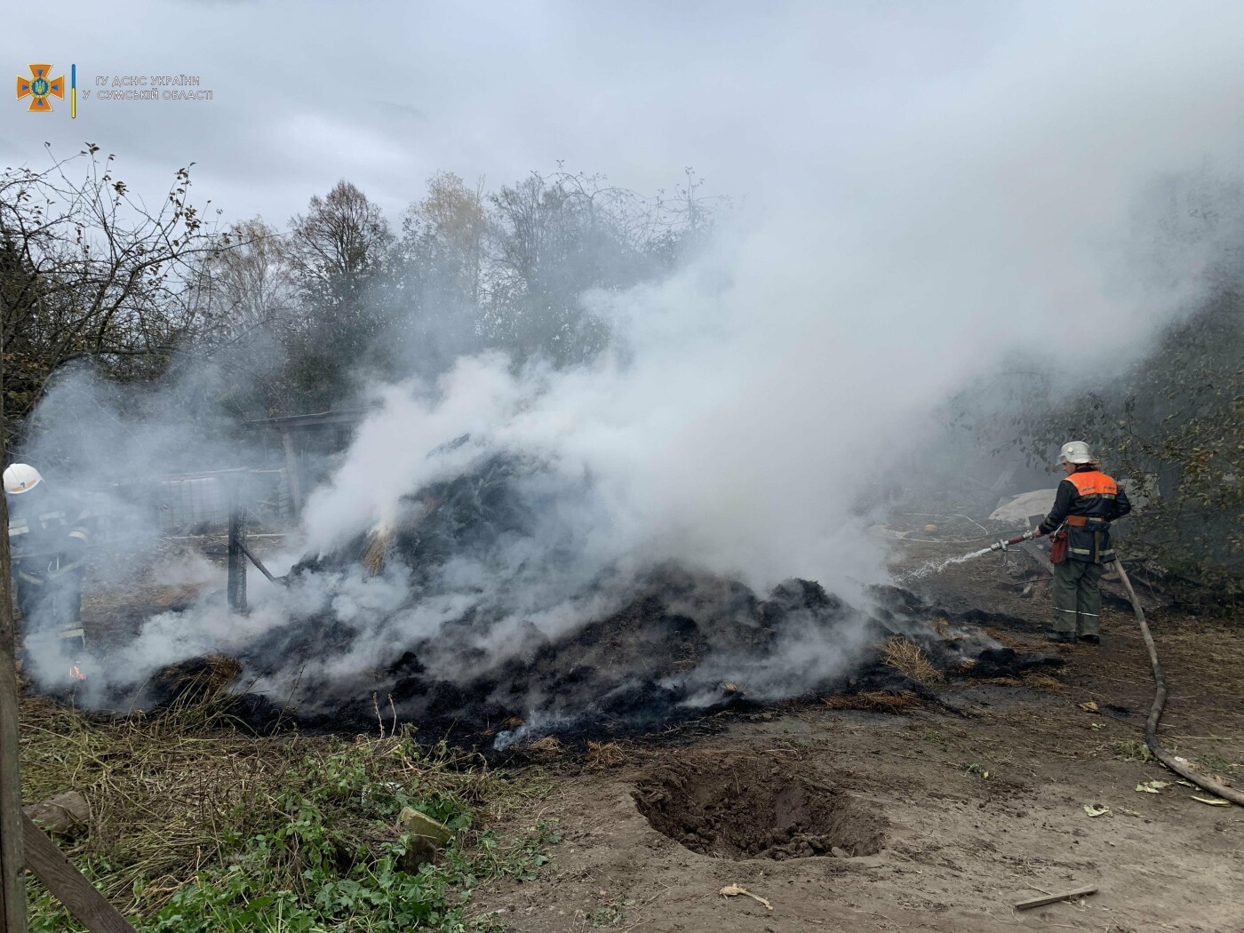 18 жовтня о 12:57, на лінію екстреного виклику 101, надійшло повідомлення про загоряння копиці сіна на території приватного домоволодіння по вул. Жовтнева в с. Собич, що на Шосткинщині.