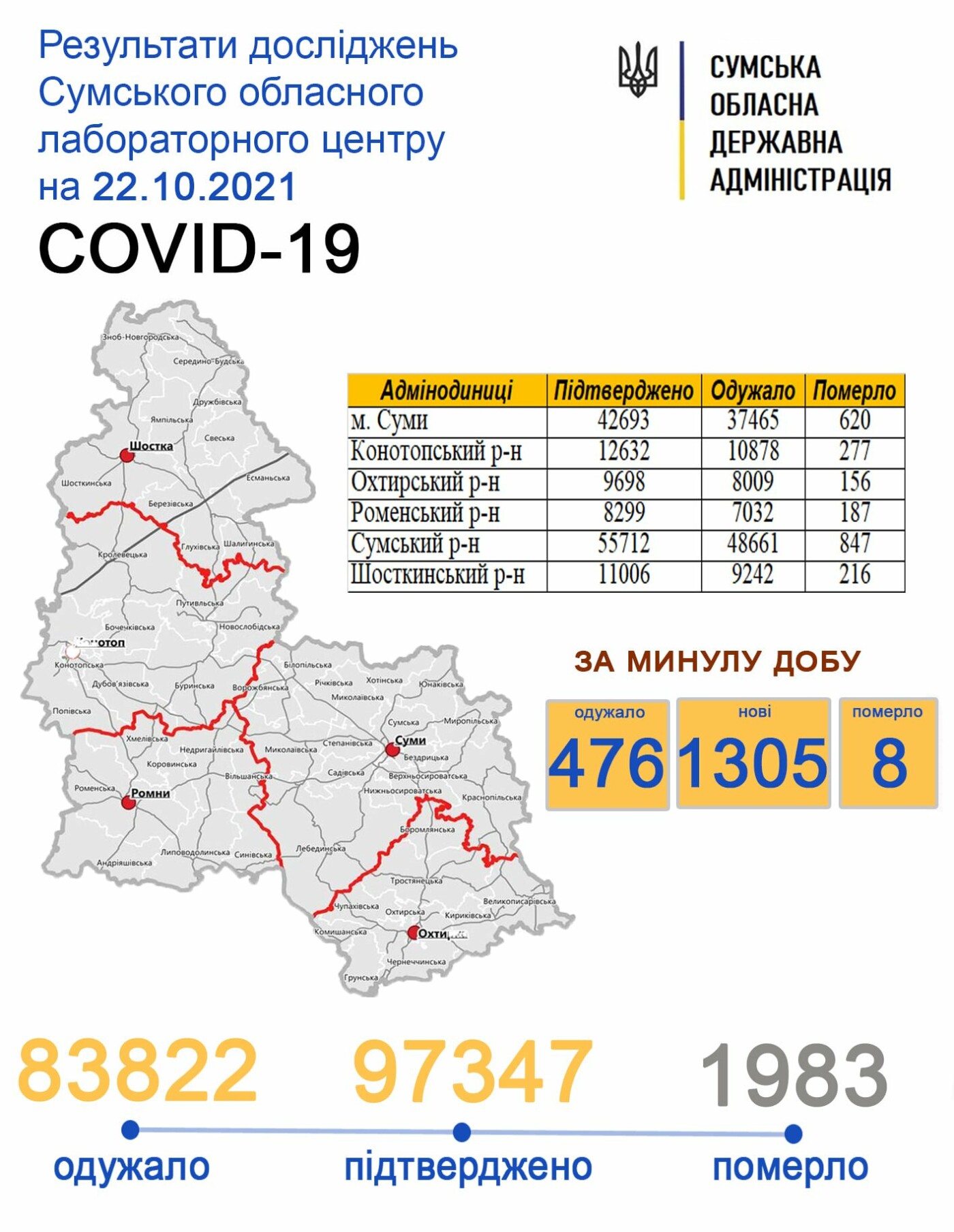 Станом на 22 жовтня 2021 року за весь час пандемії на Сумщині було зафіксовано 97347 випадків захворювання на коронавірусну інфекцію. З них 1683 летальних випадки, за минулу добу – 8 (Охтирський р-н – 3, Роменський р-н – 1, Сумський р-н – 4).