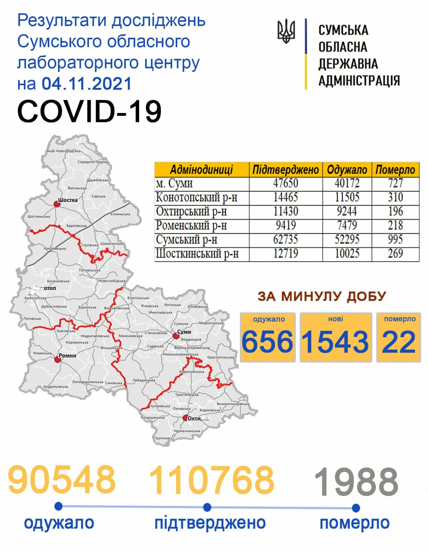 COVID-19 підтвердили у 1543осіб (Конотопський р-н – 182, Охтирський р-н – 246, Роменський р-н – 142, Сумський р-н – 765, Шосткинський р-н – 208)