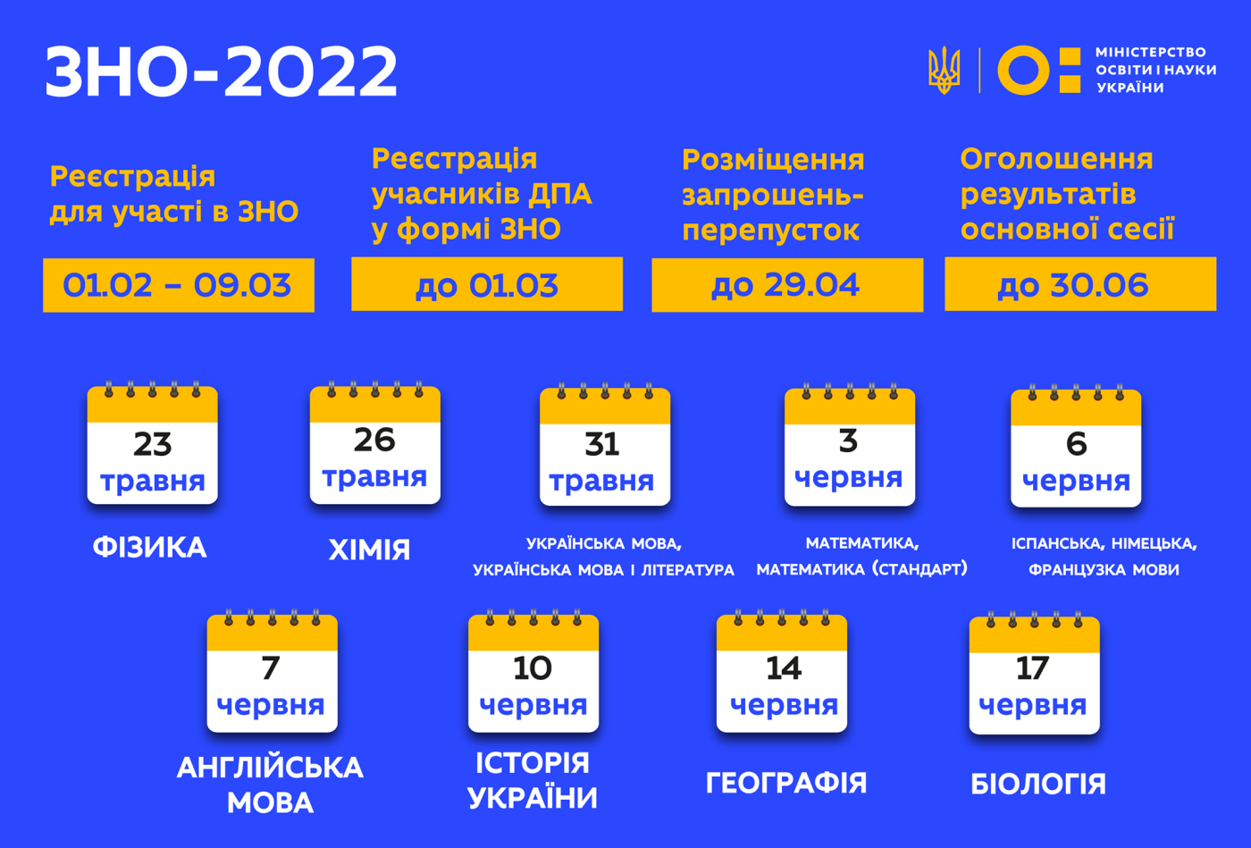 Тестування основної сесії ЗНО-2022 відбудуться за таким графіком: