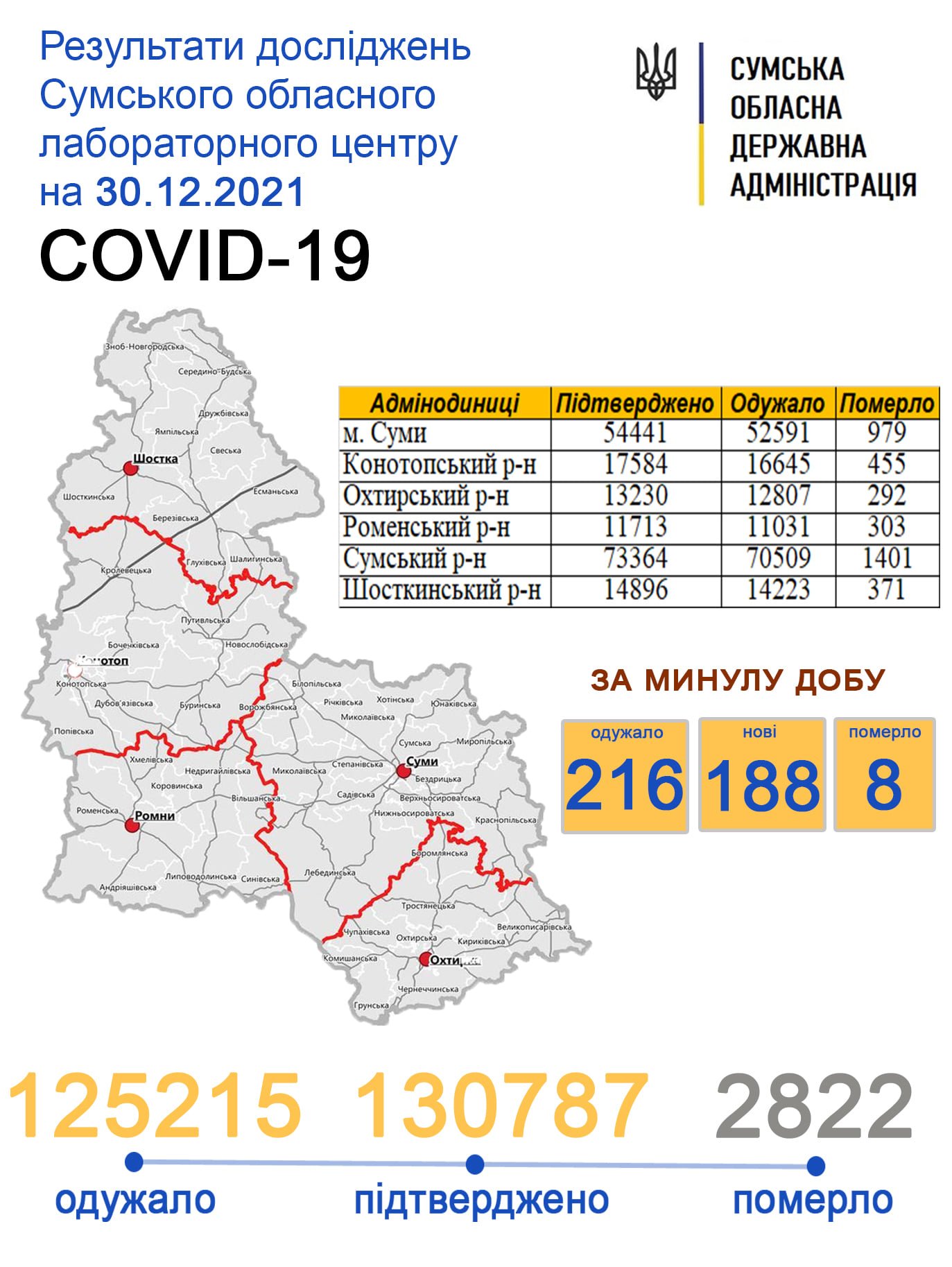Станом на 30 грудня 2021 року за весь час пандемії на Сумщині було зафіксовано 130787 випадків захворювання на коронавірусну інфекцію. З них 2822 летальних випадків, за минулу добу – 8 (Конотопський р-н – 3, Охтирський р-н – 3, Сумський р-н – 2).