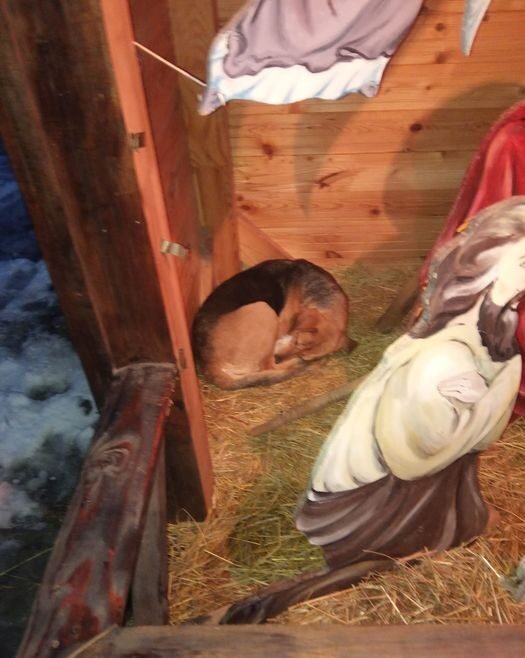 Днями чотирилапий друг був помічений у різдвяній декорації-вертепі. Тут на солом’яній підстилці пес вмостився на нічліг.