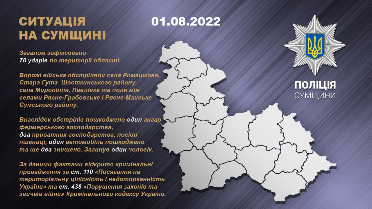 Протягом минулої доби ворожі війська обстріляли села Ромашкове, Стара Гута Шосткинського району, села Миропілля, Павлівка та поля між селами Рясне-Грабовське і Рясне-Майське Сумського району. Загалом нараховано 78 обстрілів.