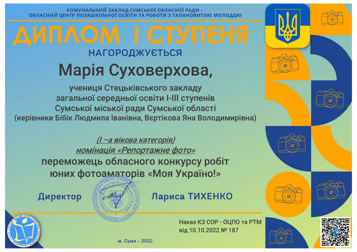 Сумчани посіли шість призових місць, а учениця Стецьківського ЗЗСО Марія СУХОВЕРХОВА з фотороботою «Моє життя – швидкість» стала переможцем у номінації «Репортажне фото».