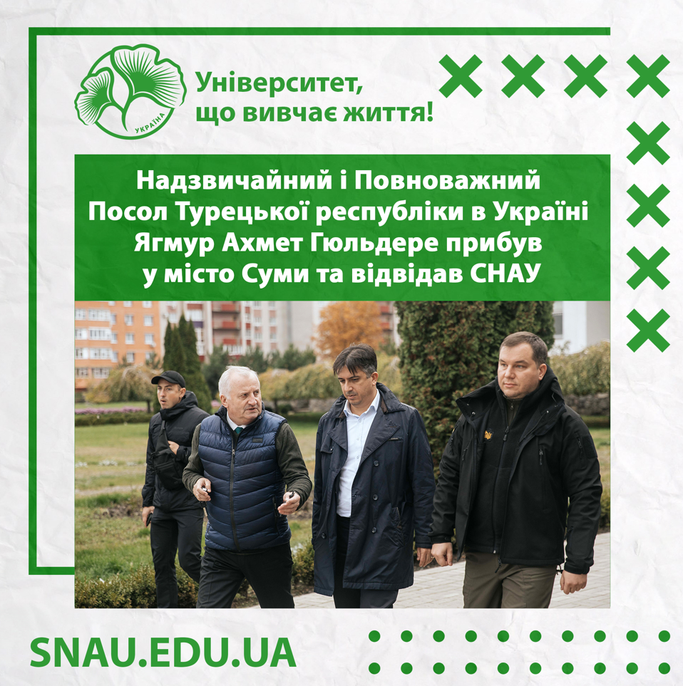 Неймовірно вдячні Надзвичайному і Поважному Послу Турецької Республіки в Україні Ягмуру Ахмету Гюльдере та голові Сумської ОВА Дмитру Живицькому за візит до Сумського національного аграрного університету. Щиро сподіваємося на можливість подальшої співпраці на науковому фронті.
