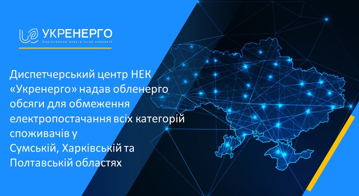 Диспетчерський центр НЕК «Укренерго» вимушений надати з 11:00 операторам розподільчих мереж (обленерго) обсяги для обмеження електропостачання всіх категорій споживачів у Сумській, Харківській та Полтавській областях. Дію графіків погодинних відключень в цих областях тимчасово припинено.