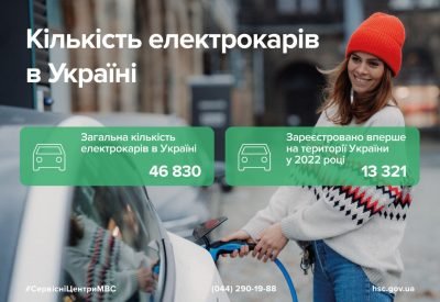 Станом на 1 січня 2023 року, загальна кількість легкових електромобілів зареєстрованих в Україні становить 46 830 автівок. За 2022 рік сервісними центрами МВС вперше було зареєстровано на території нашої держави 13 321 легкових електрокарів. Це на 56% більше порівняно з попереднім роком. Нагадаємо, за 2021 ця цифра становила 8 541.