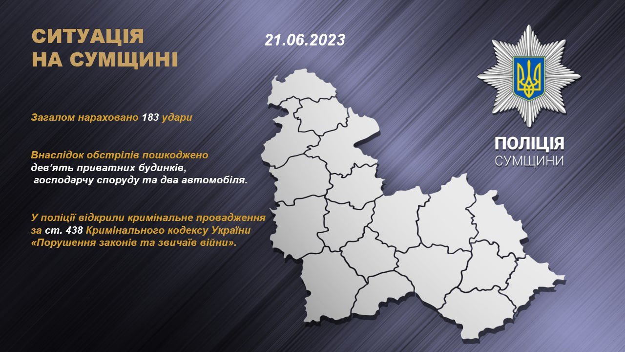 Протягом минулої доби окупанти обстріляли прикордонні населені пункти Сумської області. Загалом нараховано 183 удари.