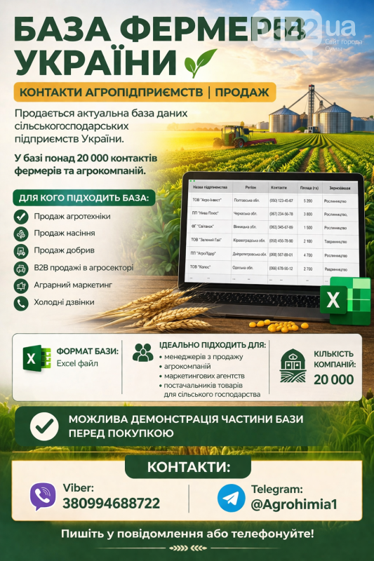 Продається актуальна база даних сільськогосподарських підприємств України. У базі зібрано понад 20 000 контактів фермерів та агрокомпаній з усієї країни, включаючи телефони, регіони та види діяльності. Формат надання — зручний Excel-файл, готовий для роботи та завантаження в CRM або для холодних дзвінків.
